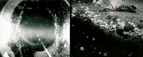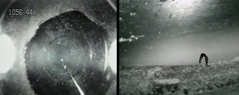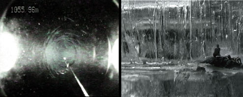 Abb. links: TiefenEis, aufgenommen mit der SGM-Eisberg-Sonde, Screenshots, 2006, Impressionen aus der Tiefe, in Echtzeit sichtbar auf dem Monitor neben dem Bohrloch. |