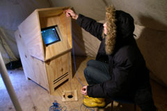 Abb. rechts: Innenraum des Station, mit Bohrloch, Monitormöbel und Sondenschnur. Fotograf: Jonathan Gröger |