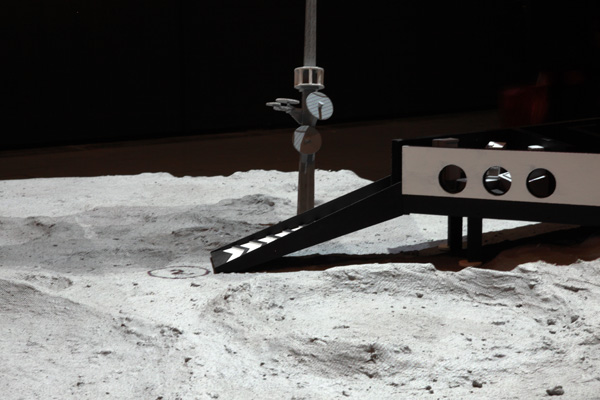 Model detail, sideview habitat with ramp and antenna mast, The Moon Goose Analogue (MGA), @ the artist