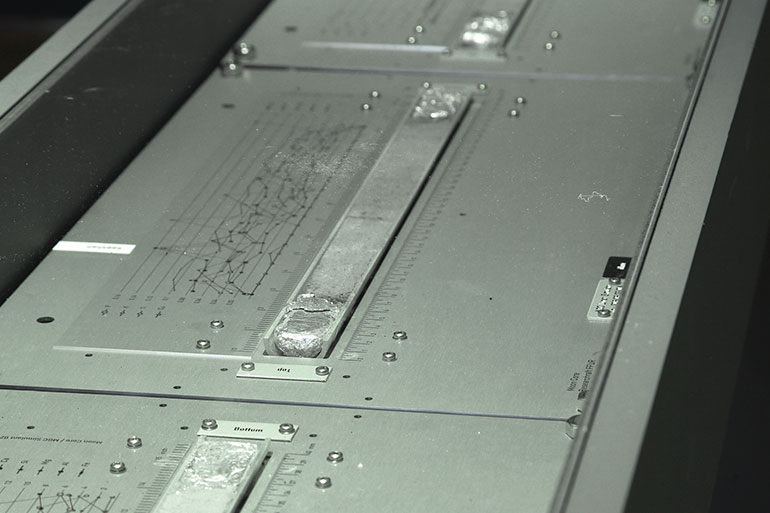 The Moon Core installation incorporats objects and data from Meyer-Brandis’s moon goose research with moon core simulants. Produced on Earth with the identical chemical composition as those found on the Moon, she questions when fiction becomes reality. Core samples are obtained by drilling down into a substance and extracting a cylindrical sample for examination. The study of stone, earth or ice cores allows us to travel back in time. In this case it means travelling in time and space to delve into the history of the Moon in search of a link to the moon geese. |