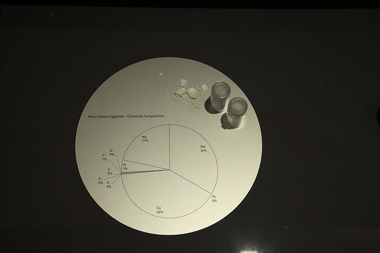 With the help of geologists and impact researchers, the artist follows the logical assumption that although the geese are not present anymore on the moon their remnants - such as droppings and eggs - must be. If we can’t find eggs, where did they go? Disintegrated over hundreds of years, would they show up in chemical analysis of the geological strata of the Moon? This installation presents the documentation and materials of the research, including moon goose eggshells which have been mechanically weathered to simulate lunar conditions.