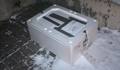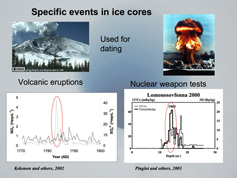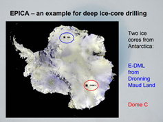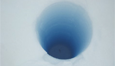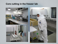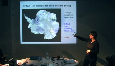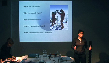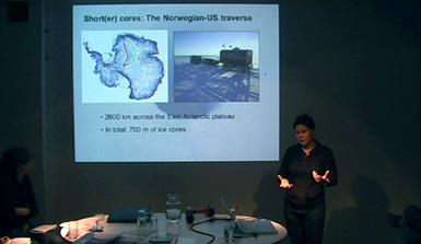 From left to right: Box with ice cores, Helgard Anschütz presenting an ice core , ice borehole (picture source NPI) |