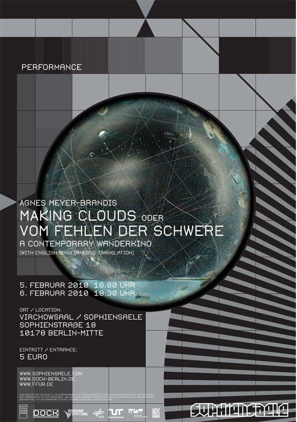 The Wanderkino deals with the Art and Science under the absence of weight. As a mix of film, performance and lecture it shows flying machines with mechanisms based on gravity and weightlessness, examines cloud cores and presents a gravimetric documentation of an unusual experiment. The audience witnesses a perambulation on the search for reality degree of constructions. It experiences the reality within the movie and the trick within the reality.